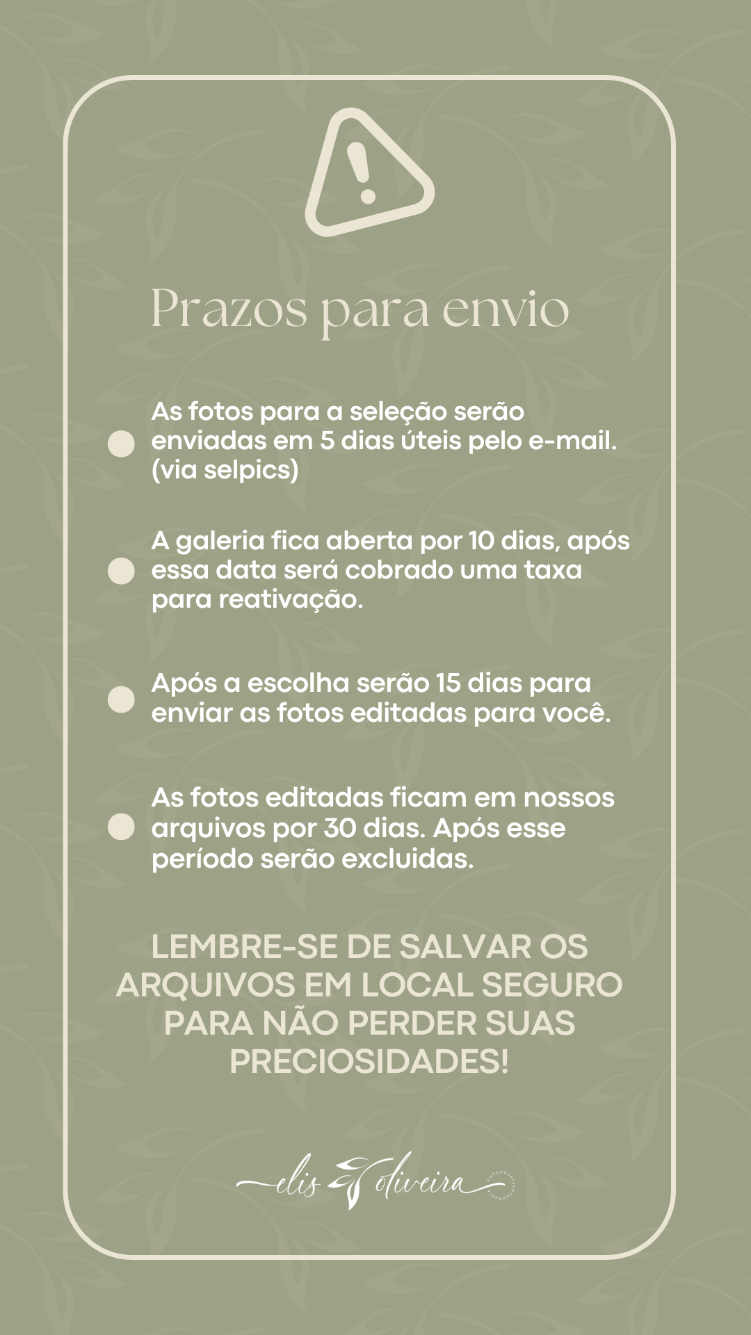E após a escolha são 15 dias para receber as fotos editadas , as fotos impressas no tamanho 10x15 ( após 30 dias.)